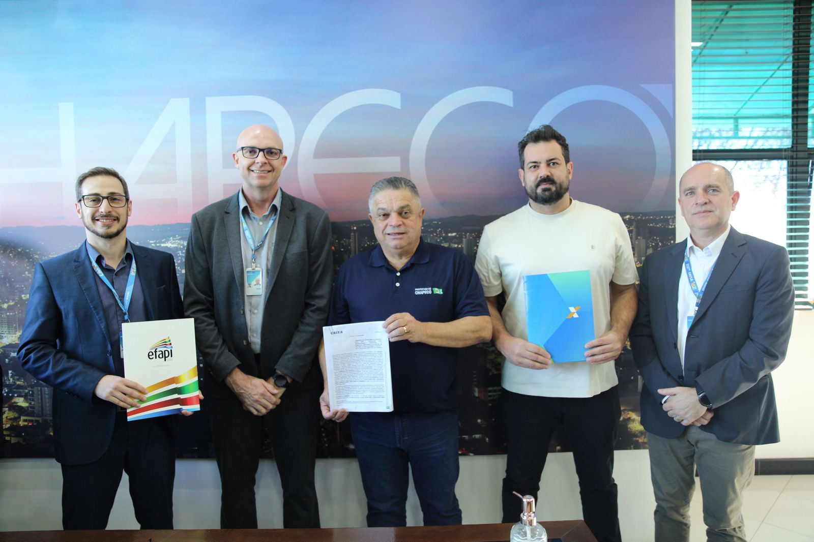 Foi assinado na manhã desta quarta-feira (17) um acordo de cooperação da Prefeitura de Chapecó com a Caixa, referente ao patrocínio para a Efapi do Brasil. O valor repassado será R$ 400 mil. Estiveram presentes no ato, realizado no gabinete do prefeito João Rodrigues, o próprio prefeito, o presidente da Comissão Central Organizadora da feira, Felipe Balzan, e os representantes da instituição financeira, sendo o Superintendente Executivo de Governo, Carlos Bonin, Superintendente Executivo de Varejo, Leandro Luiz Doss Damo, e Superintendente de Rede E.E. (em exercício), Jonas Wilpert.
